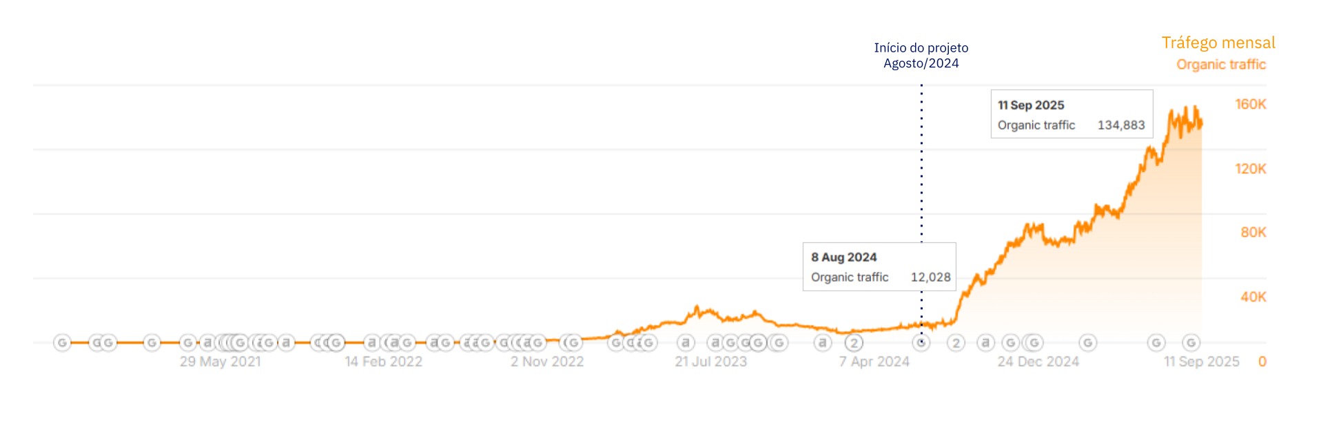 Em pouco mais de um ano, a marca alcançou um crescimento impressionante de 1.021%, somando mais de 122.855 acessos orgânicos para o site. Isso mostra que, quando a estratégia é bem executada, o crescimento sustentável é possível.
